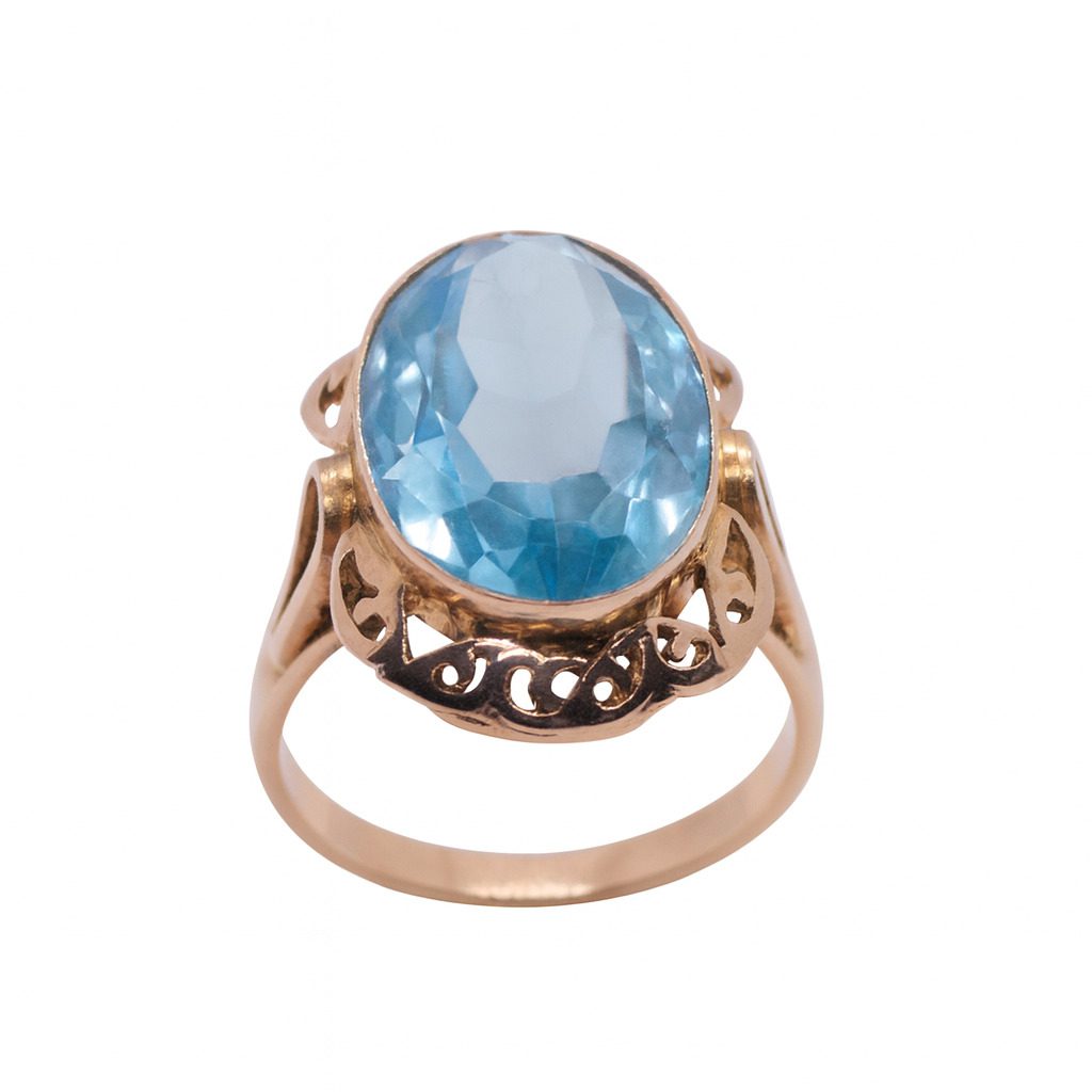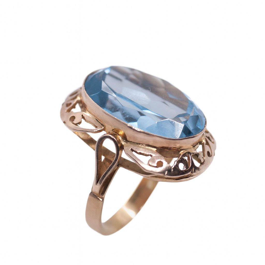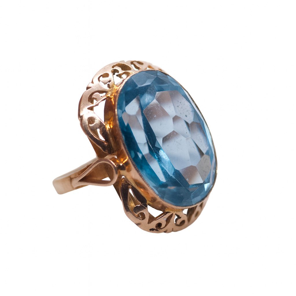 Złoty pierścionek z niebieskim kamieniem w efektownej oprawie z różowego złota próby 583. Unikatowa biżuteria w stylu vintage.