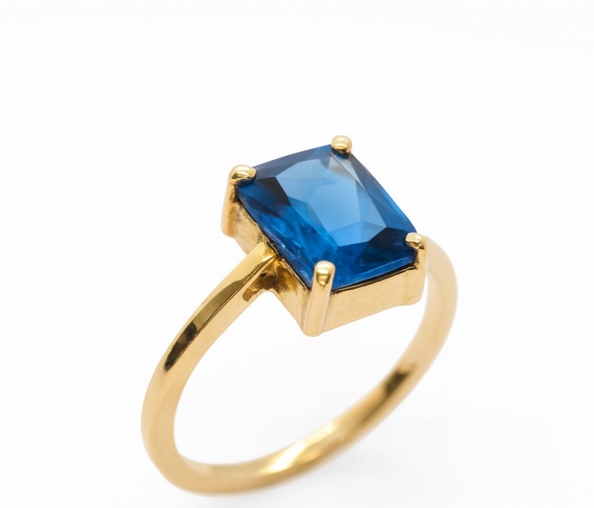 Elegancki złoty pierścionek próby 750 z dużym niebieskim kamieniem o głębokiej barwie – klasyka w luksusowym wydaniu.
