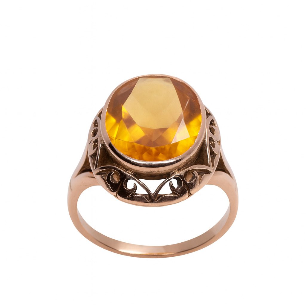 Efektowny pierścionek z różowego złota próby 585, ozdobiony dużym pomarańczowym kamieniem w ozdobnej ażurowej oprawie. Wyjątkowy dodatek w stylu vintage.