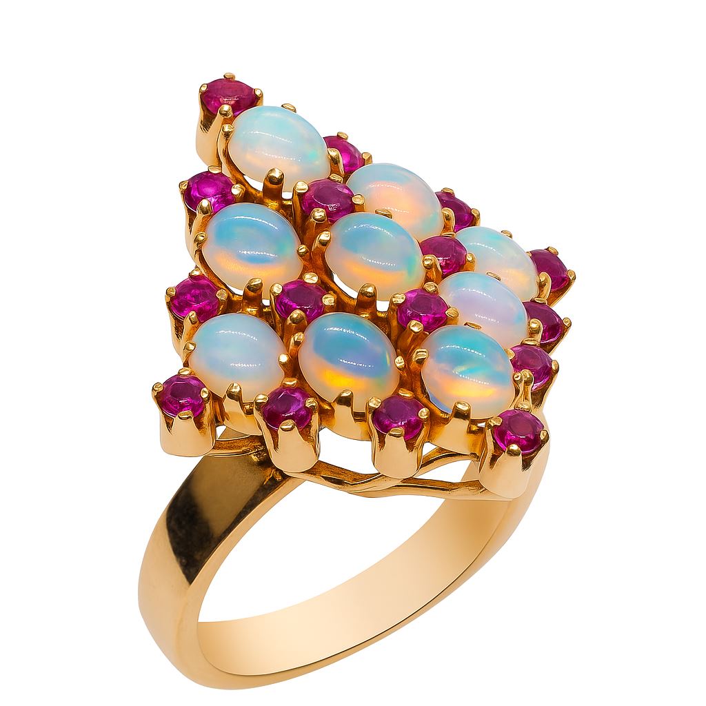 Złoty pierścionek z rubinami i opalami o masie kamieni łącznie 3,19 ct, wykonany z żółtego złota próby 750, w rozmiarze 17. Biżuteria używana, z certyfikatem.