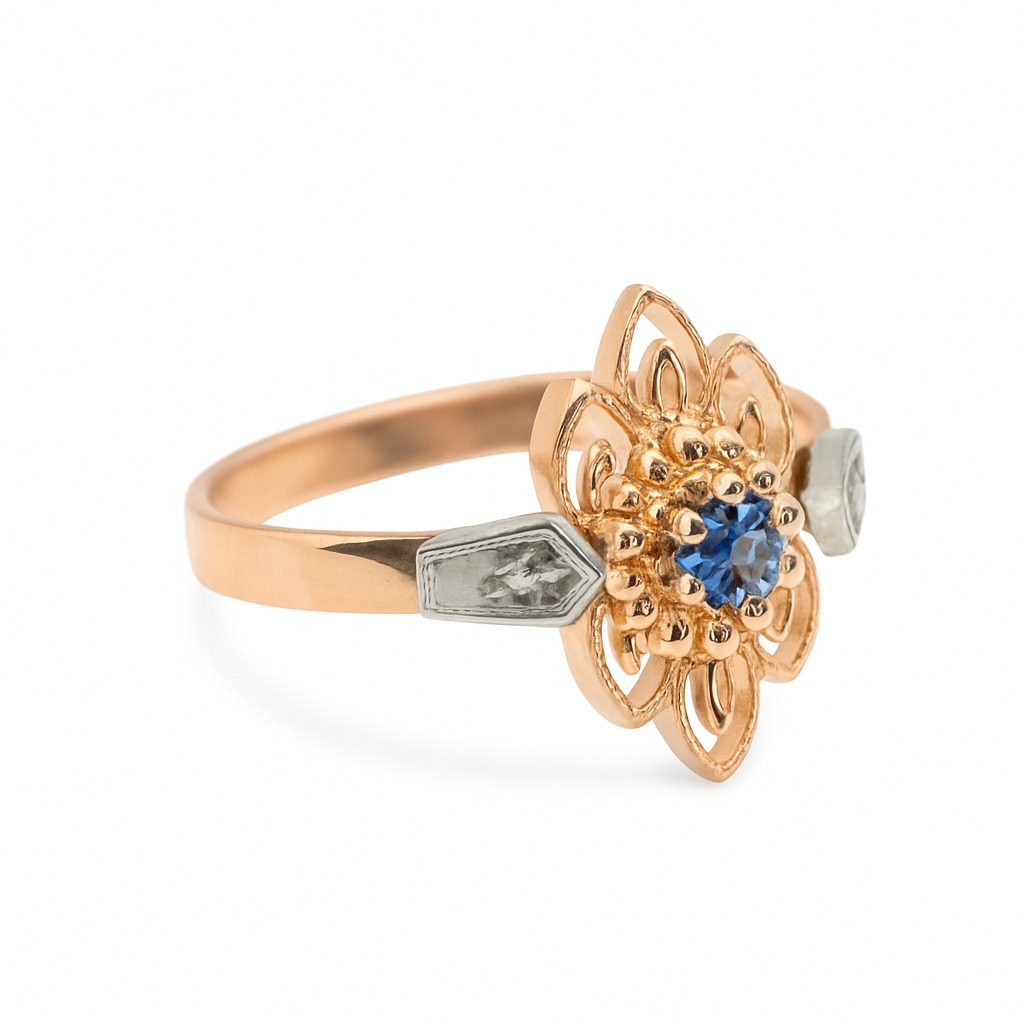 Złoty pierścionek z różowego i białego złota próby 585, ozdobiony szafirem o masie 0.20 ct. Delikatna, ażurowa forma w stylu vintage.
