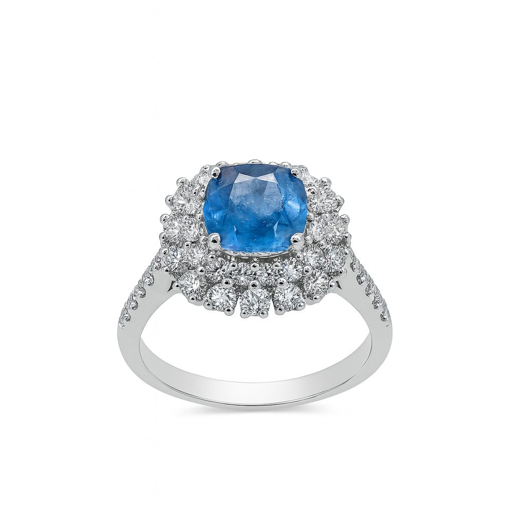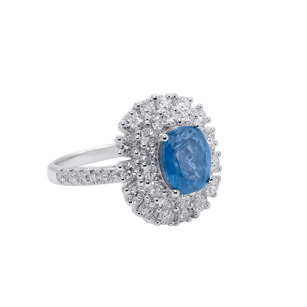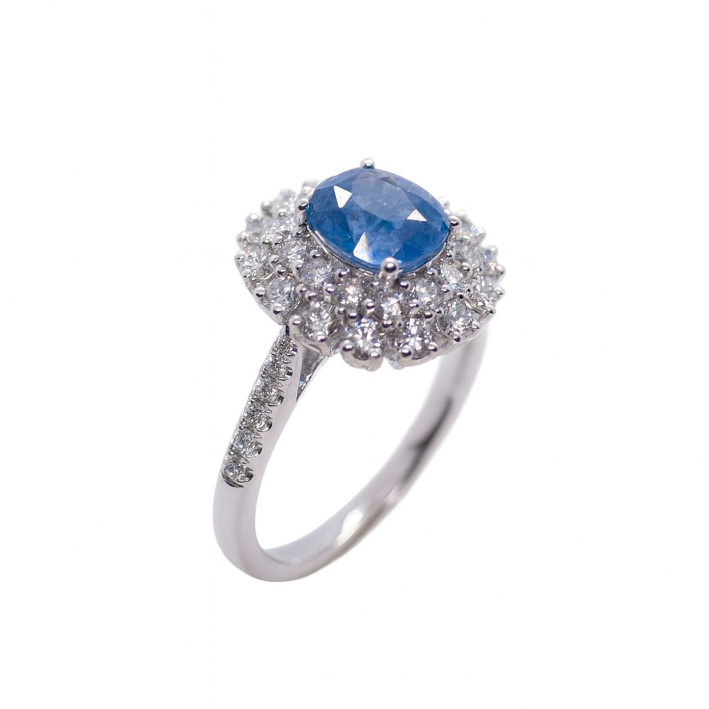 Ten olśniewający pierścionek to prawdziwa perła wśród biżuterii. Wykonany z białego złota próby 585, zdobiony centralnym szafirem o masie 2.08 ct i otoczony imponującą kompozycją diamentów o łącznej masie 1.37 ct.