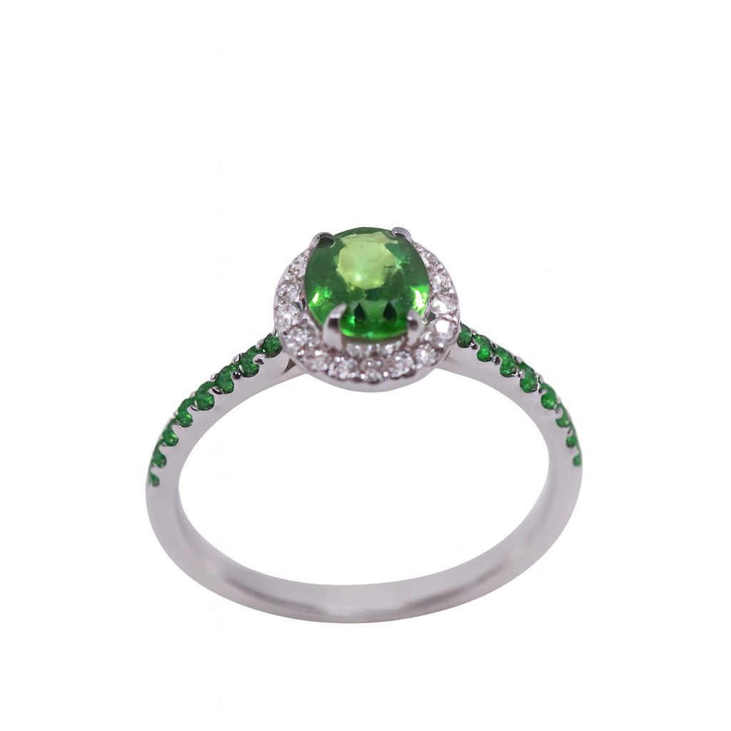 Ten wyjątkowy pierścionek został wykonany z 18-karatowego białego złota (próba 750), co gwarantuje jego najwyższą jakość i trwałość. Centralnym punktem biżuterii jest piękny, fasetowany tsavoryt o głębokiej, zielonej barwie, otoczony błyszczącymi diamentami o masie 0.16 ct.