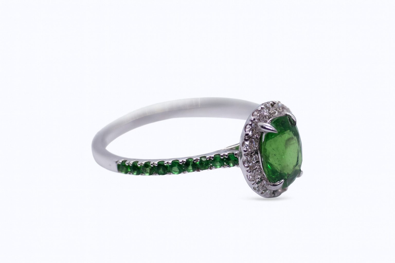 Elegancki pierścionek z białego złota próby 750, ozdobiony intensywnie zielonymi tsavorytami (1.44 ct) oraz diamentami o masie 0.16 ct. Subtelny i pełen blasku dodatek.