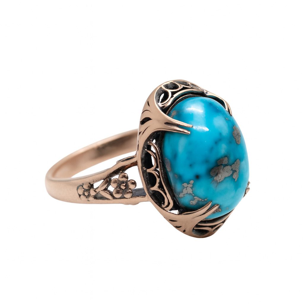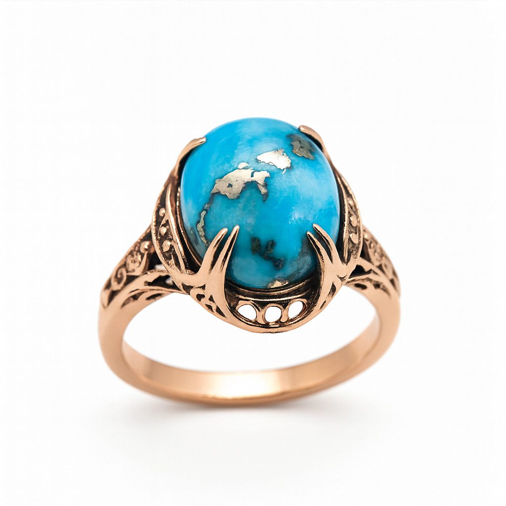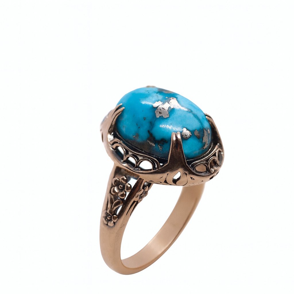 Ten unikalny pierścionek z żółtego złota próby 585 to biżuteria, która przyciąga wzrok nie tylko intensywnym kolorem, ale również wyjątkową formą oprawy. Głównym elementem kompozycji jest turkus o masie 5.40 ct – kamień znany ze swoich właściwości ochronnych i niezwykłej, niebieskiej barwy z naturalnymi żyłkami, które nadają mu indywidualny charakter.