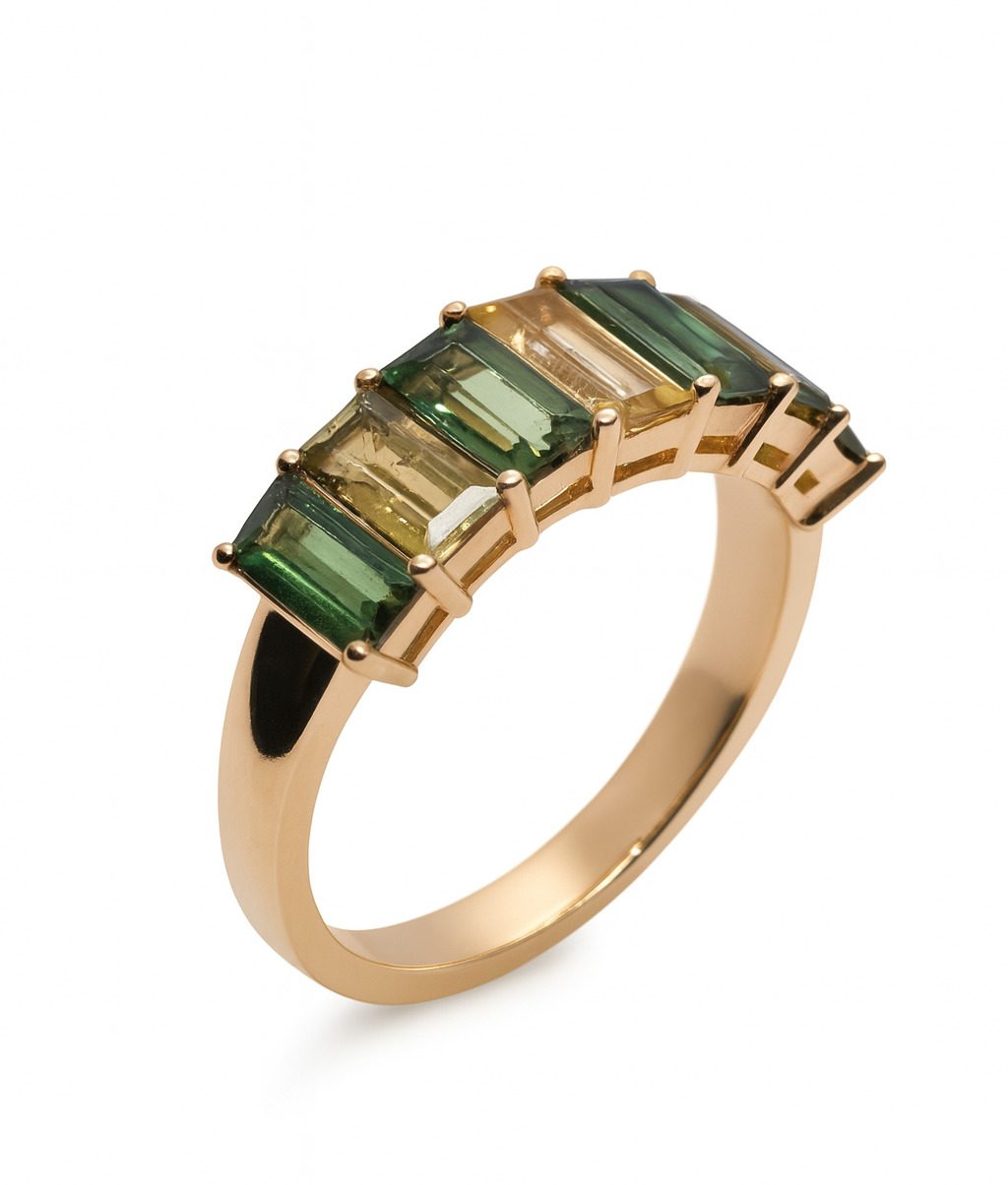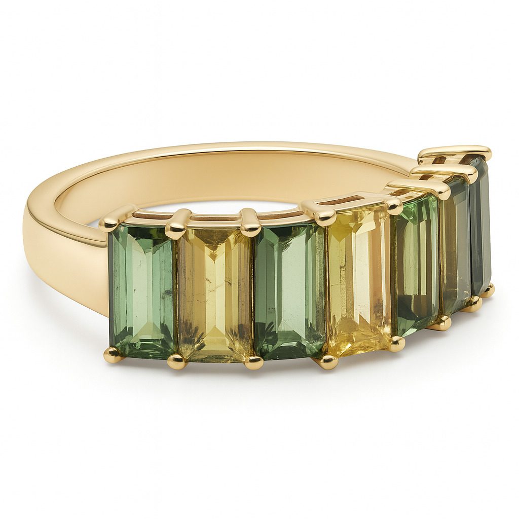Zachwycający pierścionek wykonany z żółtego złota próby 585, który wyróżnia się niebanalnym zestawieniem wielobarwnych turmalinów. Kamienie o łącznej masie 2,38 ct zostały osadzone w linii, tworząc harmonijny gradient odcieni zieleni, oliwki i złota. Każdy turmalin w szlifie prostokątnym prezentuje się elegancko i nowocześnie, a całość nabiera artystycznego charakteru. Pierścionek o wadze 3,86 g i rozmiarze 15 to propozycja dla kobiet ceniących indywidualny styl, naturalne kamienie i niepowtarzalny design.