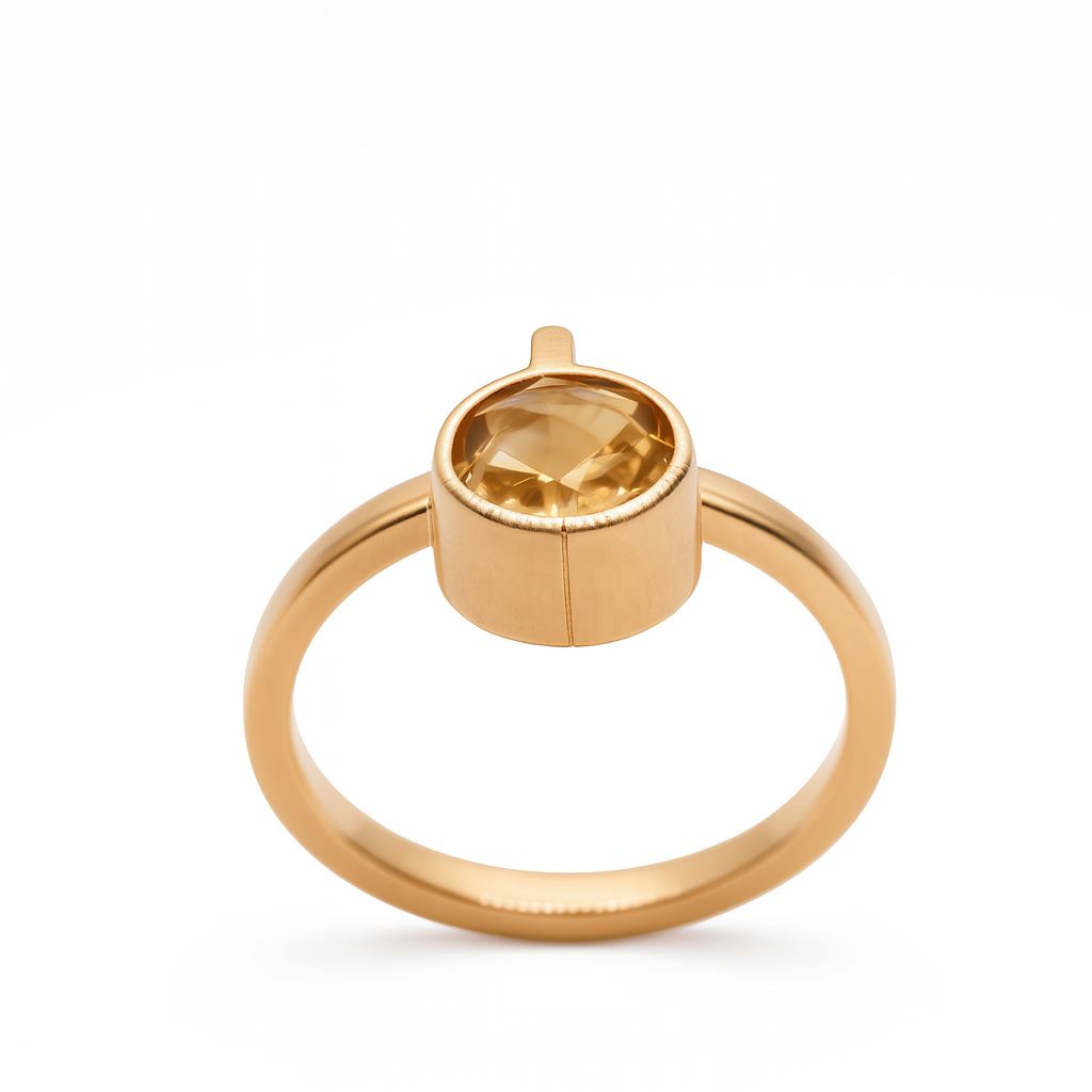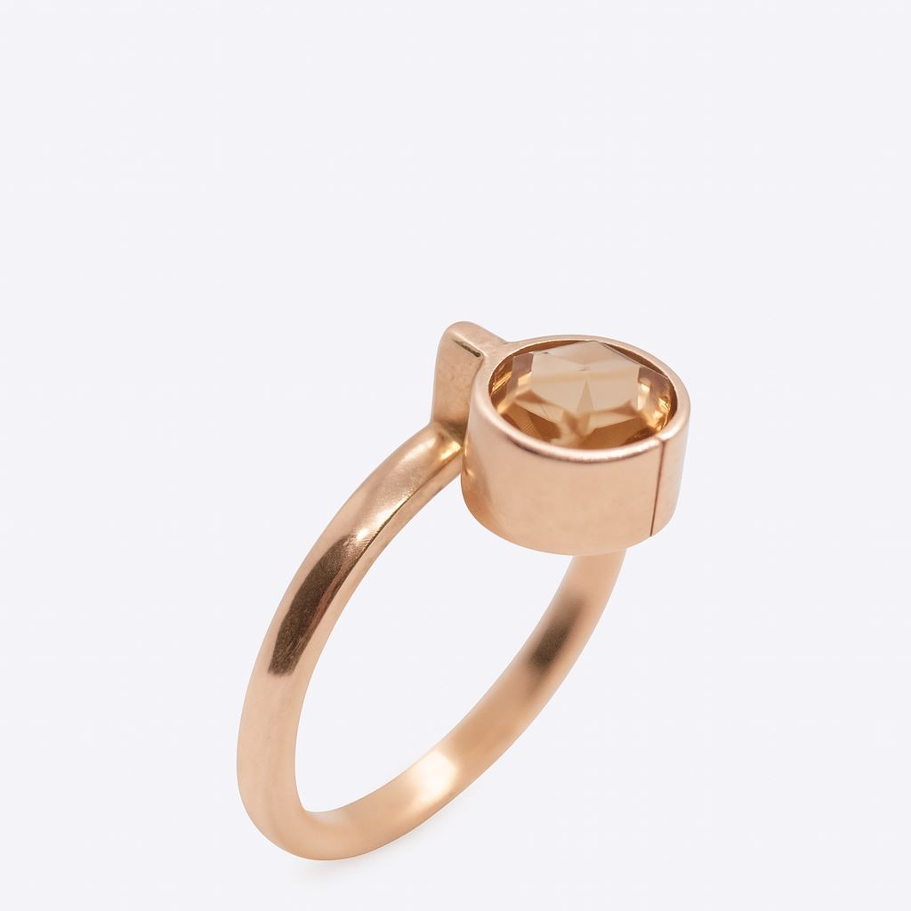 Minimalistyczny pierścionek z różowego złota próby 585, ozdobiony syntetycznym żółtym kamieniem. Rozmiar 12. Wyrób używany, o nowoczesnym charakterze.