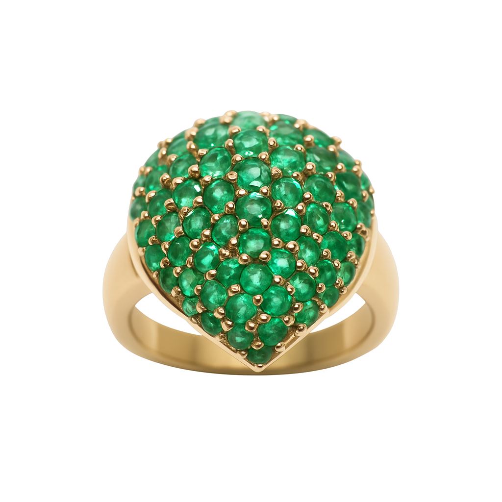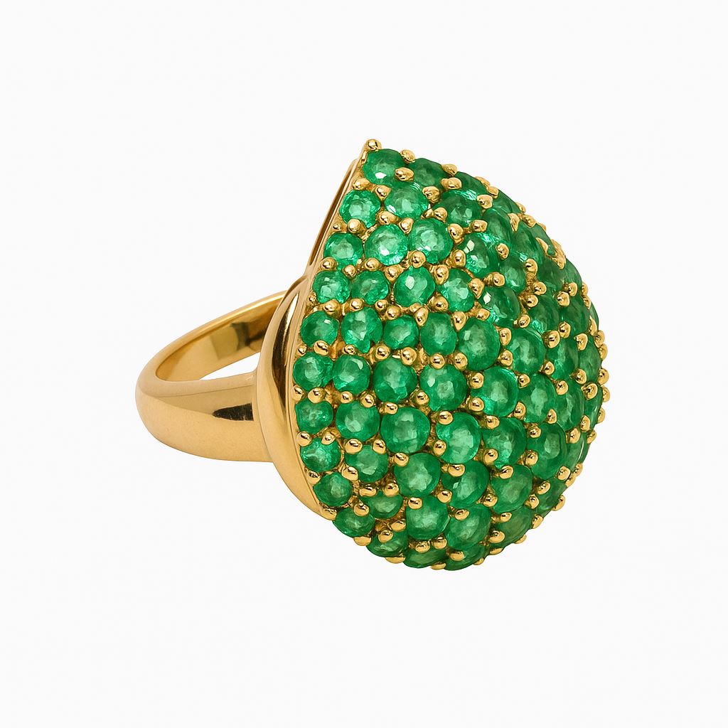 Wyjątkowy złoty pierścionek wykonany z wysokiej jakości złota próby 585, zachwyca kompozycją licznych, intensywnie zielonych szmaragdów o łącznej masie 2,50 ct. Kamienie zostały starannie oprawione, tworząc niezwykle efektowną i luksusową powierzchnię, która przyciąga spojrzenia. Klasyczny żółty kolor złota doskonale komponuje się z barwą szmaragdów, podkreślając ich naturalny urok i głębię koloru. Wyrób używany, w doskonałym stanie, idealny dla miłośników biżuterii o wyrazistym charakterze. Waga pierścionka wynosi 5,39 g, rozmiar 10.
